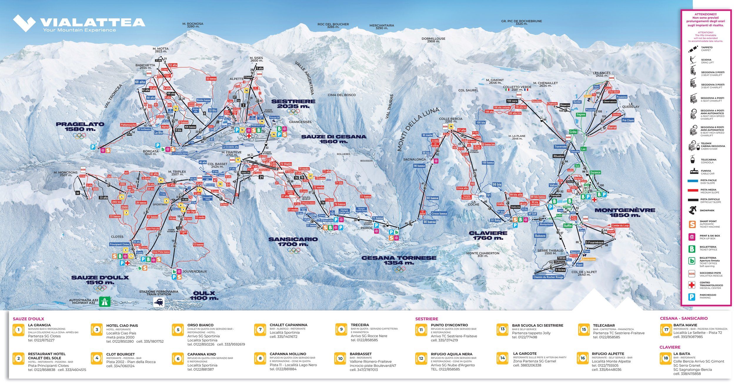 Mit der Gondelbahn von Sestriere gelangt man auf den Mount Fraiteve (2.701 m), von wo aus die längste Abfahrt des Skigebiets über 7 Kilometer bis zur Mittelstation Pariol hinunterführt. Auch Snowboarder und Freestyler finden in der Via Lattea beste Bedingungen: Der Snowpark in Sestriere, der Park in Montgenèvre sowie der "Double Black Park" am Rio Nero bei Sauze d’Oulx mit Quarterpipe, Kicker und Rails bieten jede Menge Action.