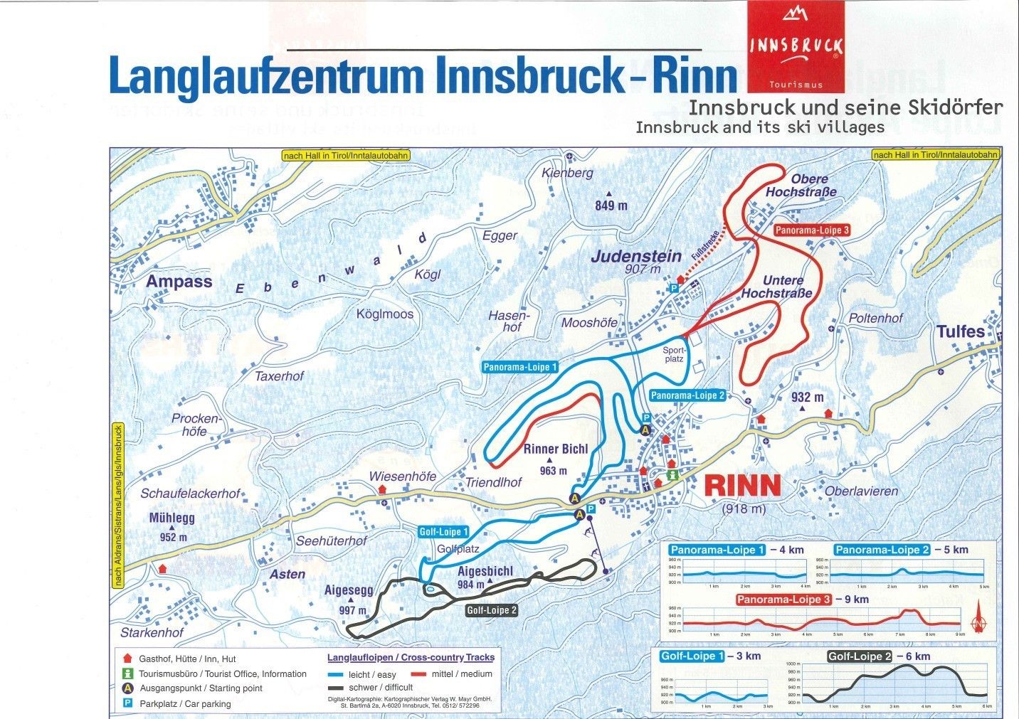Von Kolsassberg aus können Sie einen Großteil dieser Langlaufgebiete innerhalb weniger Minuten erreichen. Insgesamt bietet die Region um Innsbruck 120 km Loipen überwiegend leichten und mittleren Schwierigkeitsgrades. Auf den Mittelgebirgsterrassen rund um Innsbruck, in Rinn und Mutters/Natters kommen 40 km Loipen zusammen.