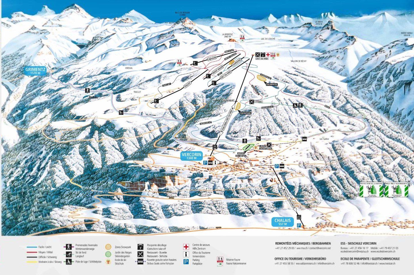 Im Hausskigebiet Vercorin stehen Ihnen 35, überwiegend blaue und rote Pistenkilometer auf Höhen zwischen 1.340 und 2.374 m zur Verfügung. Anfänger haben die Möglichkeit in der ortsansässigen Skischule unter professioneller Anleitung die ersten Schwünge zu ziehen. Für die Kleinsten wird eine Kinderbetreuung angeboten. Auch Adrenalin-Junkies kommen mit drei schwarzen Abfahrtskilometern und einigen Tiefschnee-Möglichkeiten nicht zu kurz.